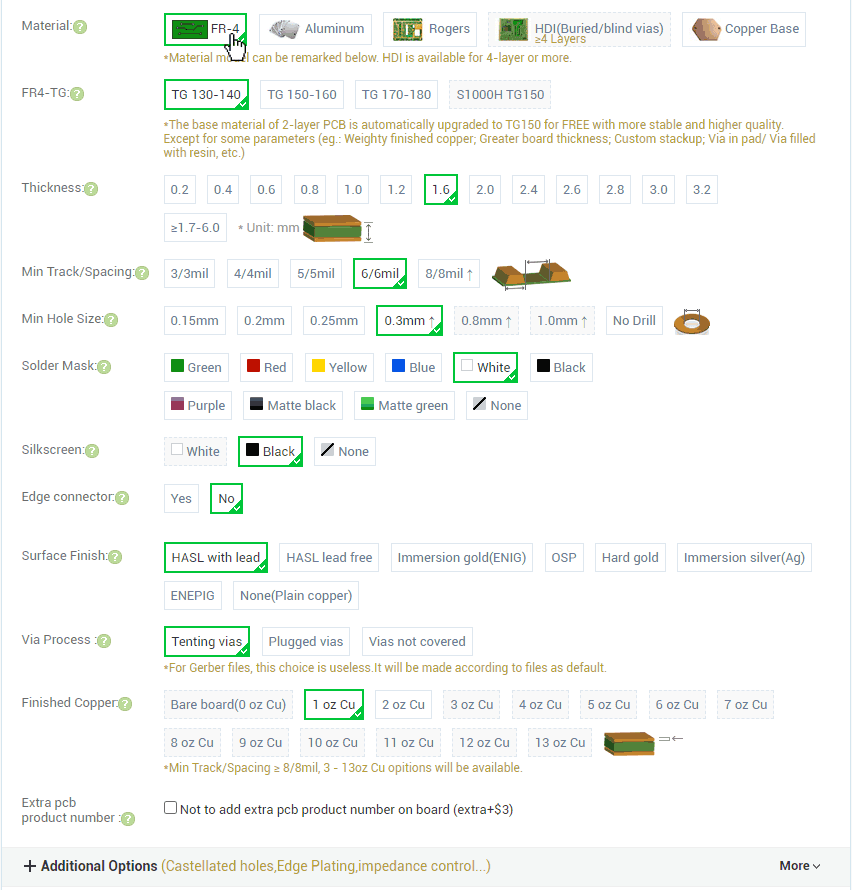 You can use the parameters selected by default, or change the parameter options, such as the base material, surface finish, special processes, order notes, etc.