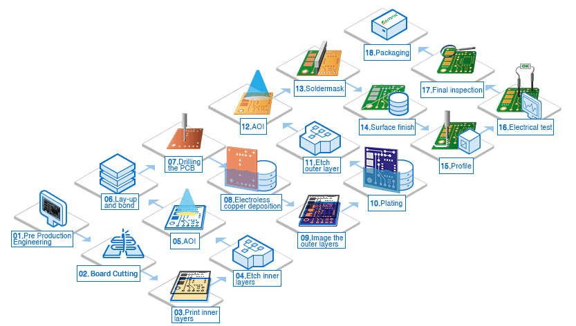 | 01.Pre Production Engineering | 02.Board Cutting | 03.Print inner layers | 04.Etch inner layers | 05.AOI |