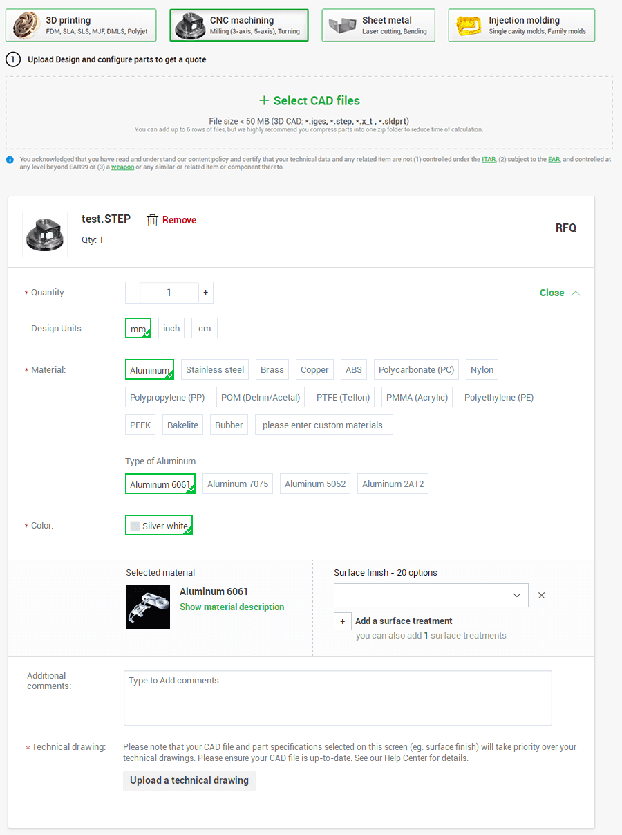 1. Pricing: We have multiple materials available, the best way is to upload your file and get accurate quotation by instant pricing engine and manual review
